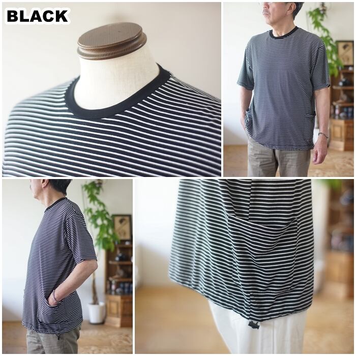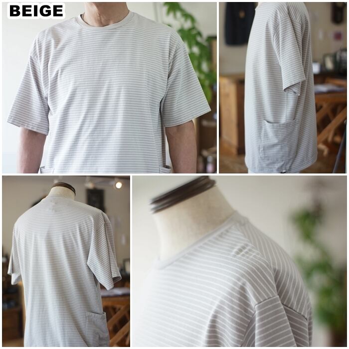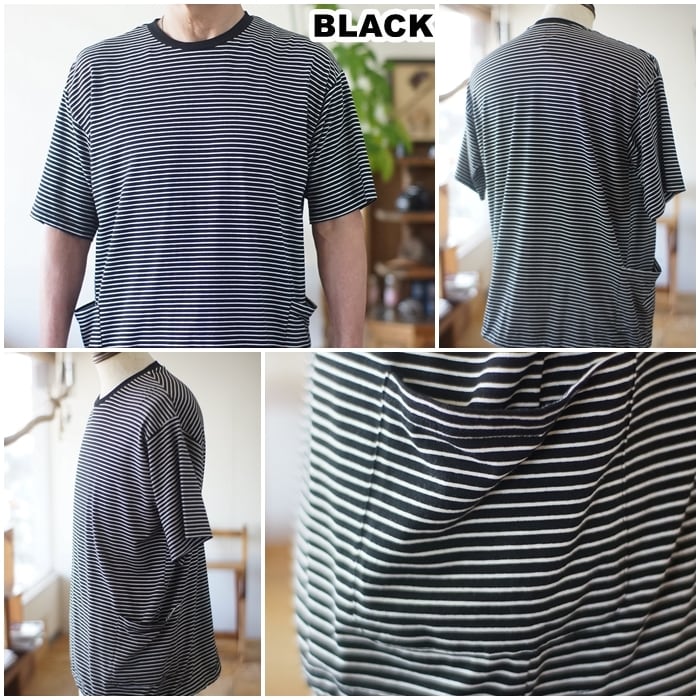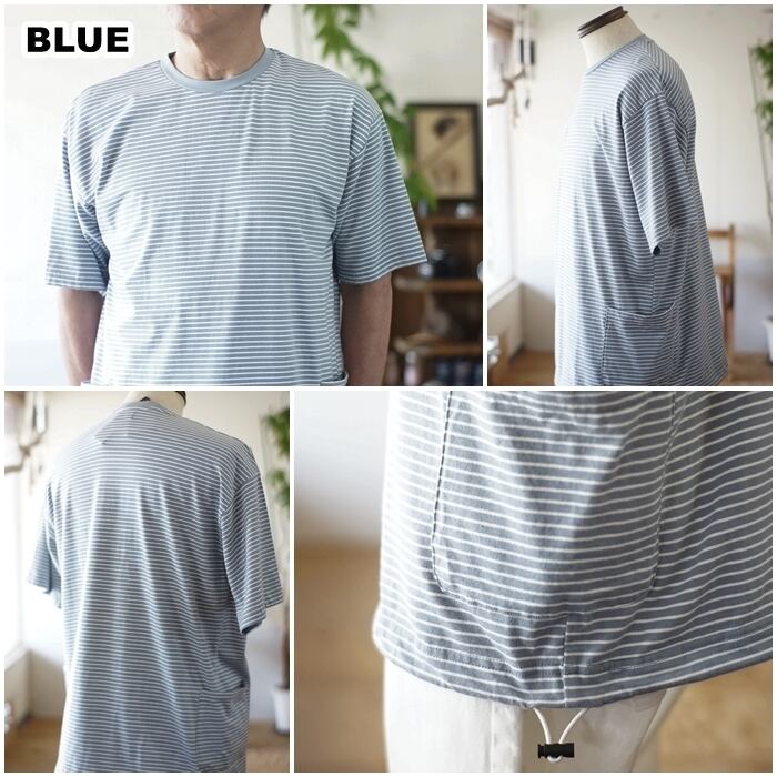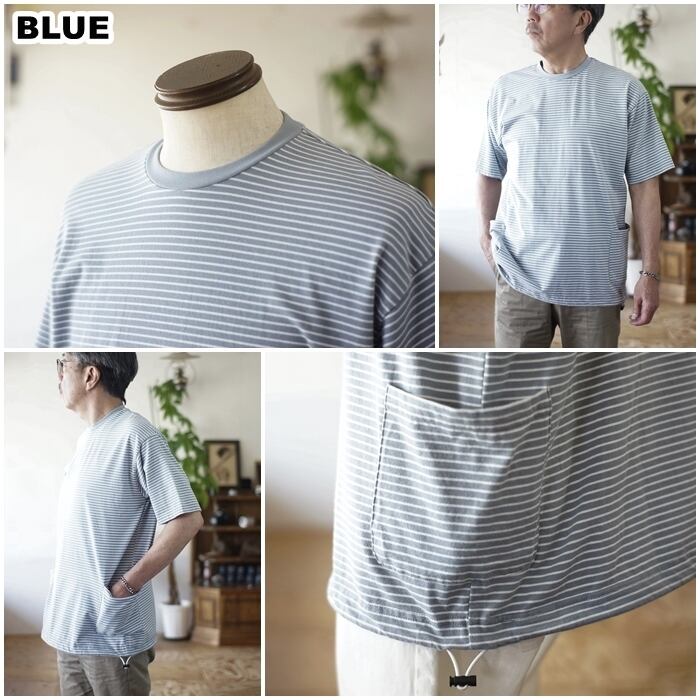 ピッチの細いボーダーで少しキレイな印象でややワイドなシルエットでサイドのポケットもあり、存在感のあるカットソー。