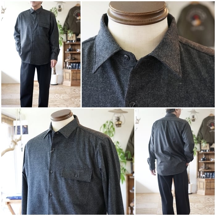 定番の尾州ウール 90% 、ナイロン 10% の素材を使用したルーズフィットシャツ。