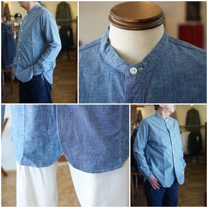イギリス軍のバンドカラーシャツからイメージして製作したブルーシャンブレー長袖シャツ。