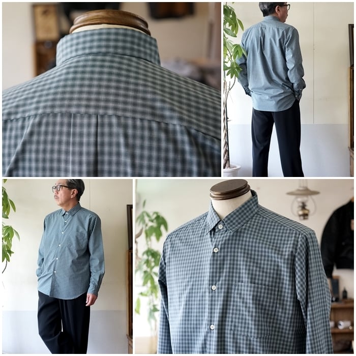 脇下から自然に広がるAラインと、ステッチを極力省いたクリーンな表情が特徴の定番シャツです。
